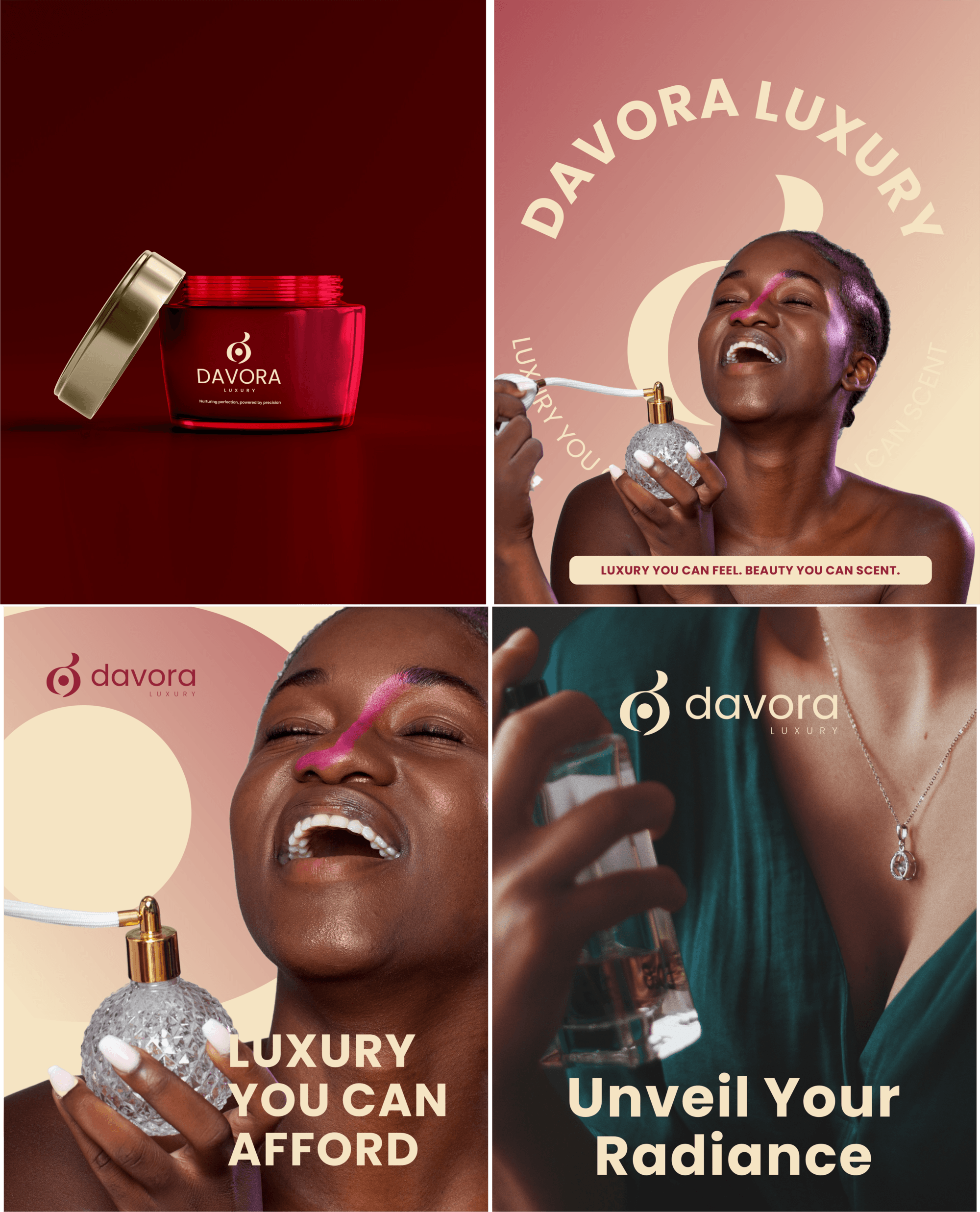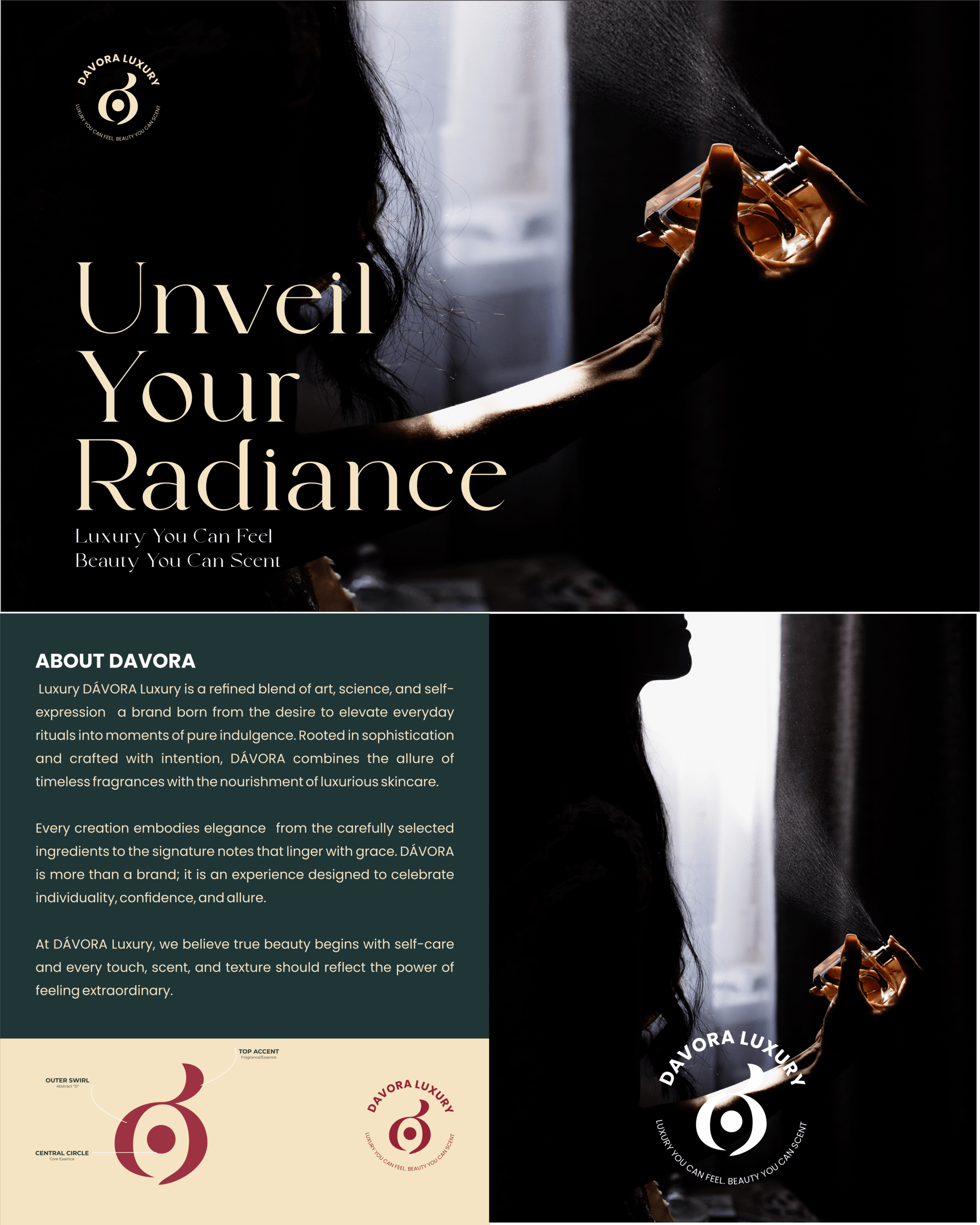 To position DÁVORA Luxury as a refined and memorable beauty brand, we focused on building a visual identity rooted in elegance, symbolism, and sensory experience. The strategy was to create a brand system that communicates luxury while subtly reflecting the brand's focus on fragrance and skincare.