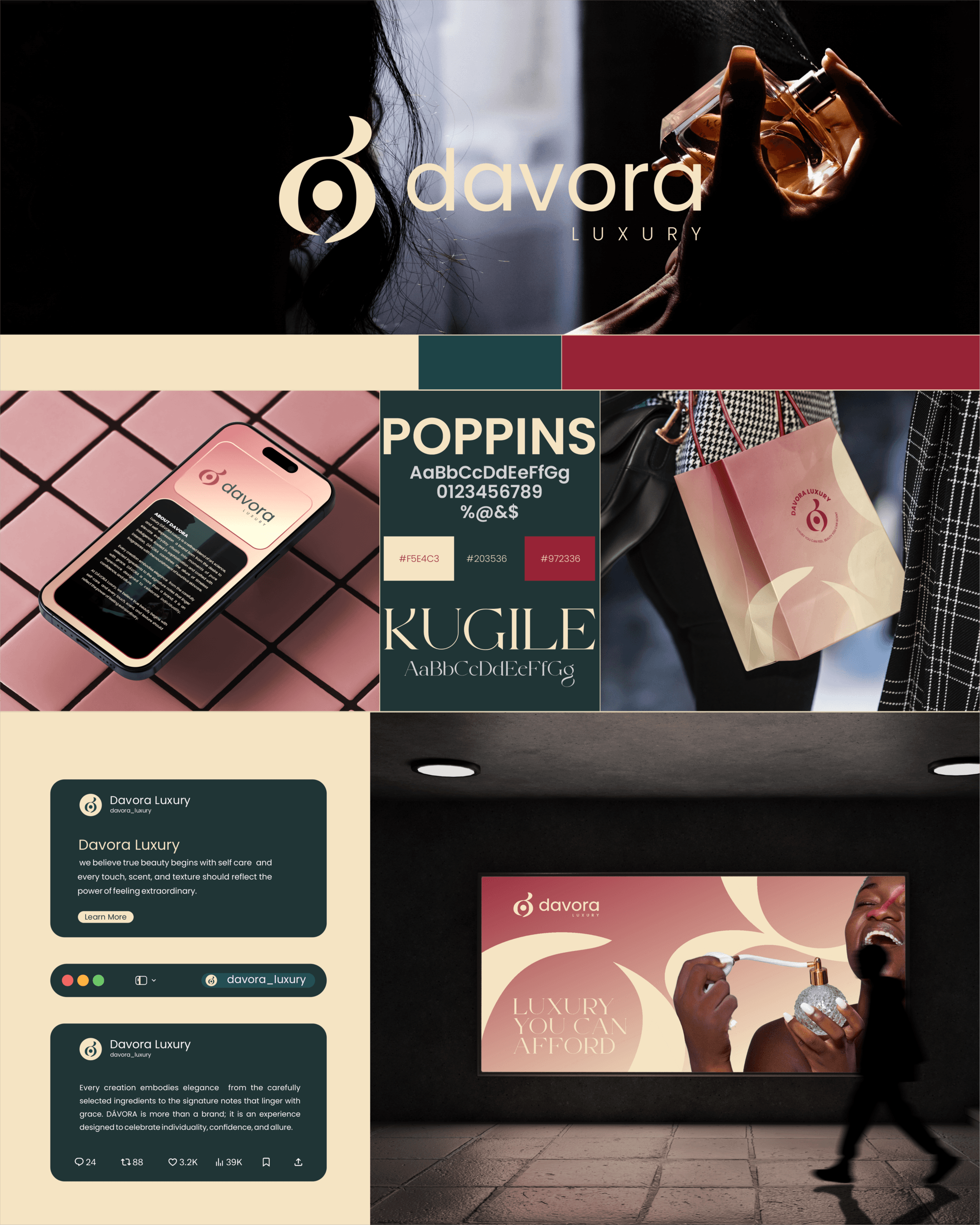 DÁVORA Luxury needed a brand identity that could capture the essence of sophistication, sensuality, and modern luxury while standing out in a highly competitive beauty and fragrance market. The challenge was to create a visual system that felt premium and timeless, while still reflecting the brand's focus on self-care, fragrance, and skincare. Beyond aesthetics, the identity had to communicate elegance and indulgence across multiple touchpoints — from the logo to the packaging and labels. The goal was to craft a design language that felt distinctive, memorable, and cohesive, transforming DÁVORA into a brand that visually expresses luxury, confidence, and refined beauty