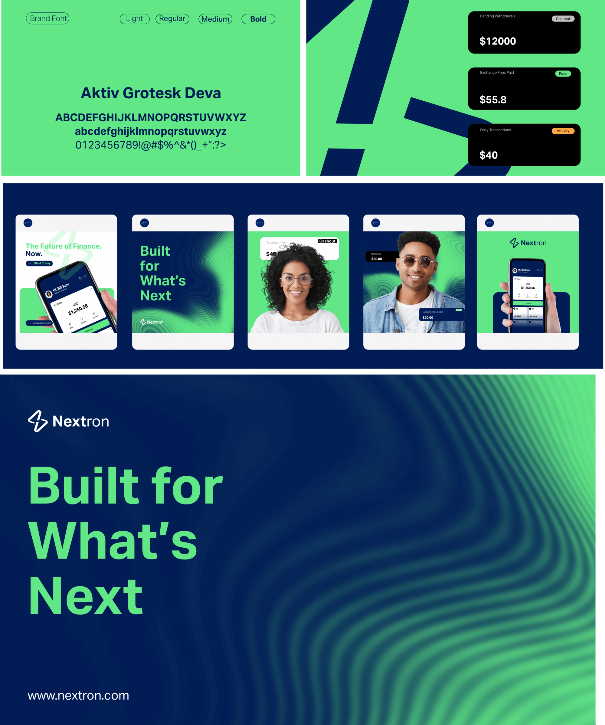 Nextron needed a brand identity that communicated trust, innovation, and sophistication to both retail and institutional investors. I built a strategic identity system from the ground up — starting with positioning research and ending with a complete digital brand toolkit.